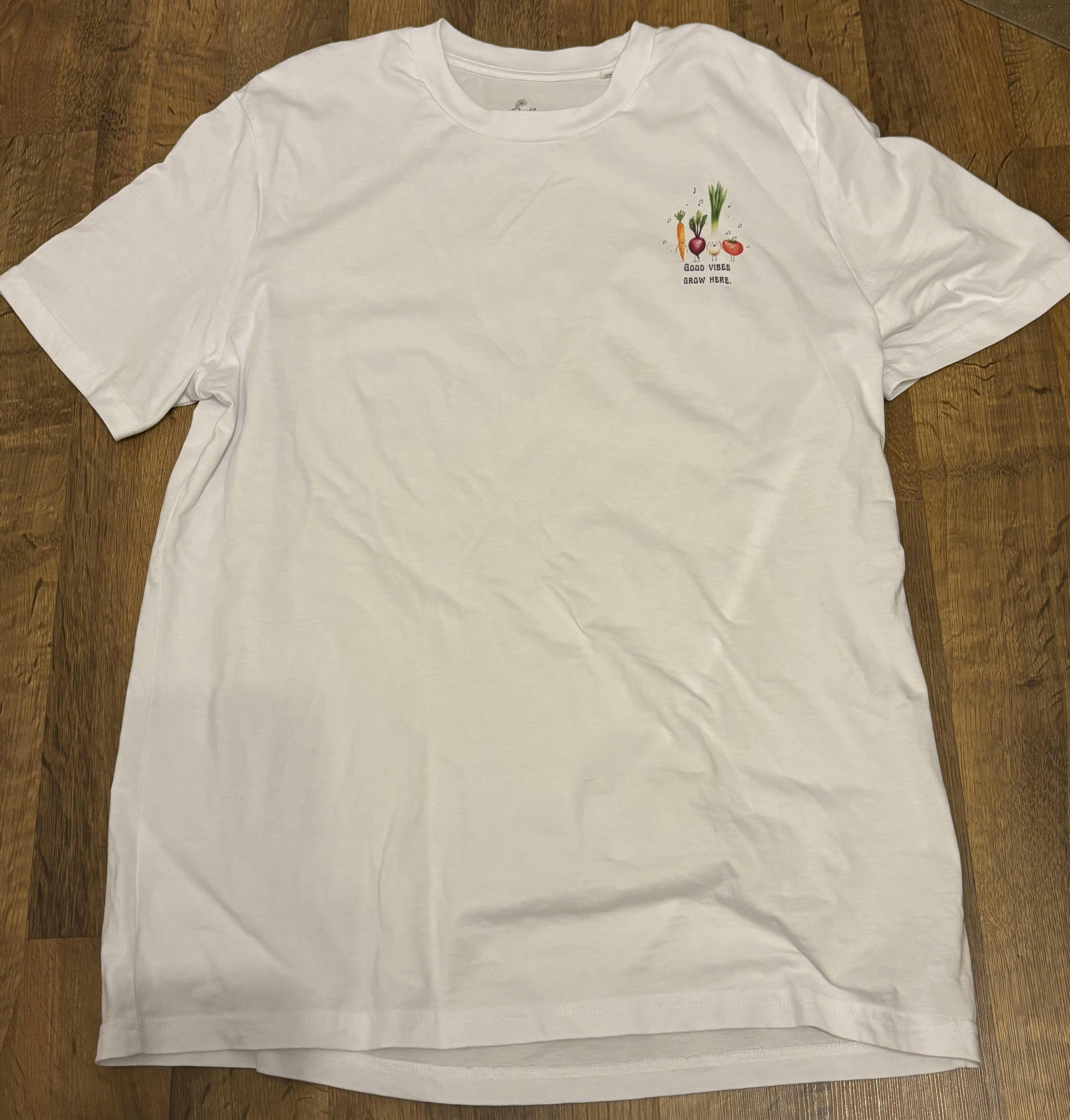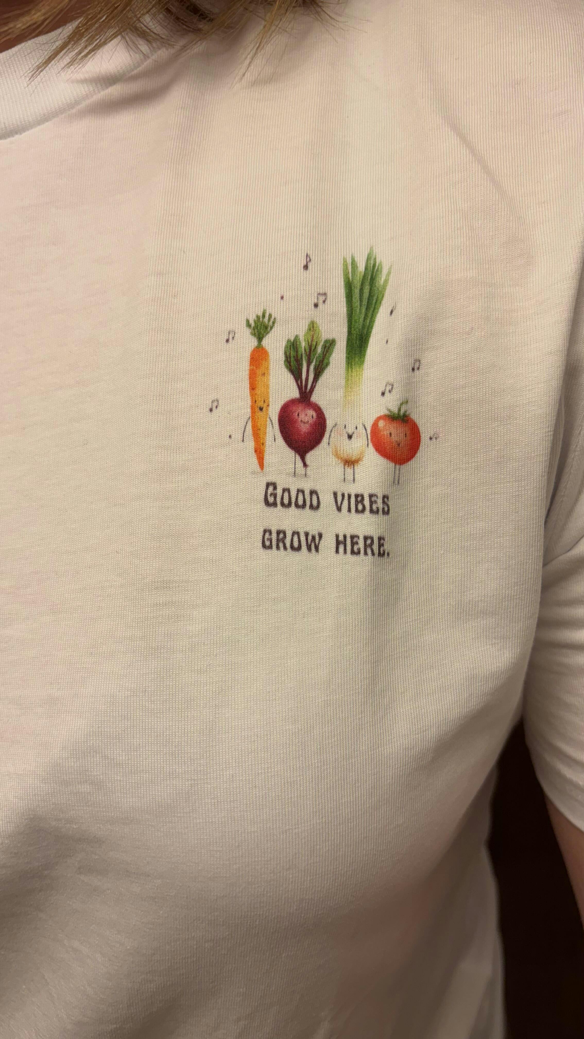 Ein bisschen Humor, ein bisschen Gartenliebe – das Motiv „Good vibes grow here“ bringt gute Laune auf dein Shirt.